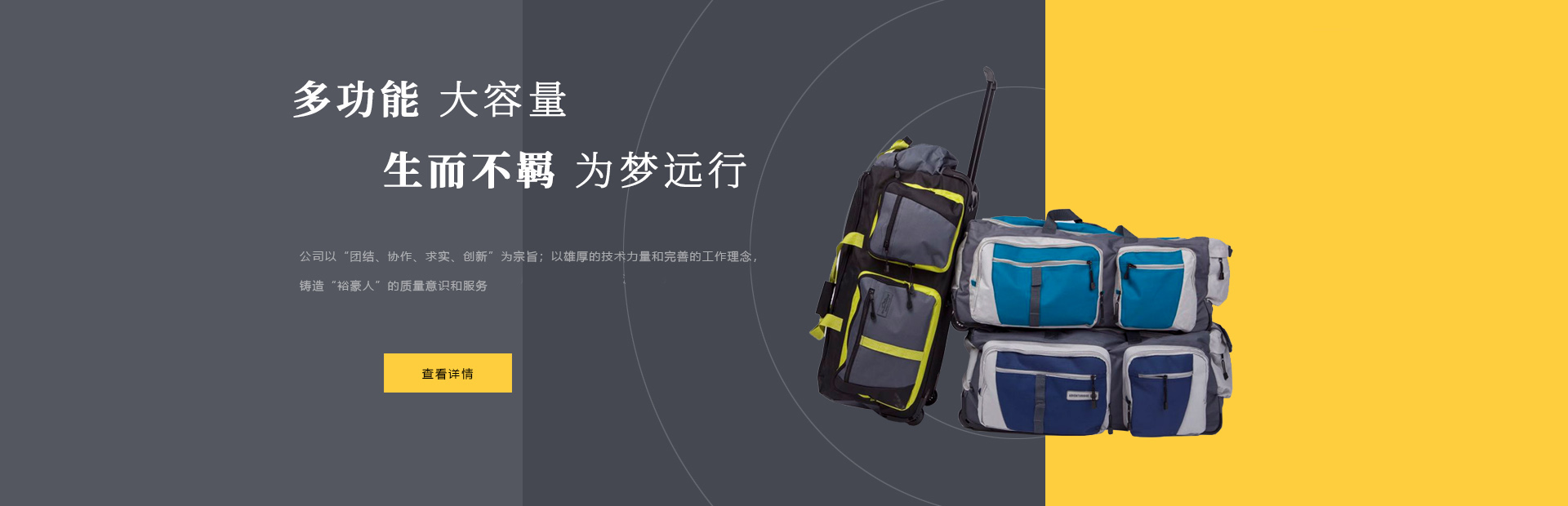 本公司是一家集設計,制造,加工,貿易為一體的專業箱包生產出口企業。已有20多年箱包生產經驗。公司廠區位于中國浙江省海寧市鹽官工業園區,占地15000平方米,建筑面積10000平方米,員工150人,年生產能力260萬只(套)。 公司以尼龍,滌淪,牛津布,P...